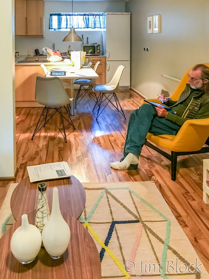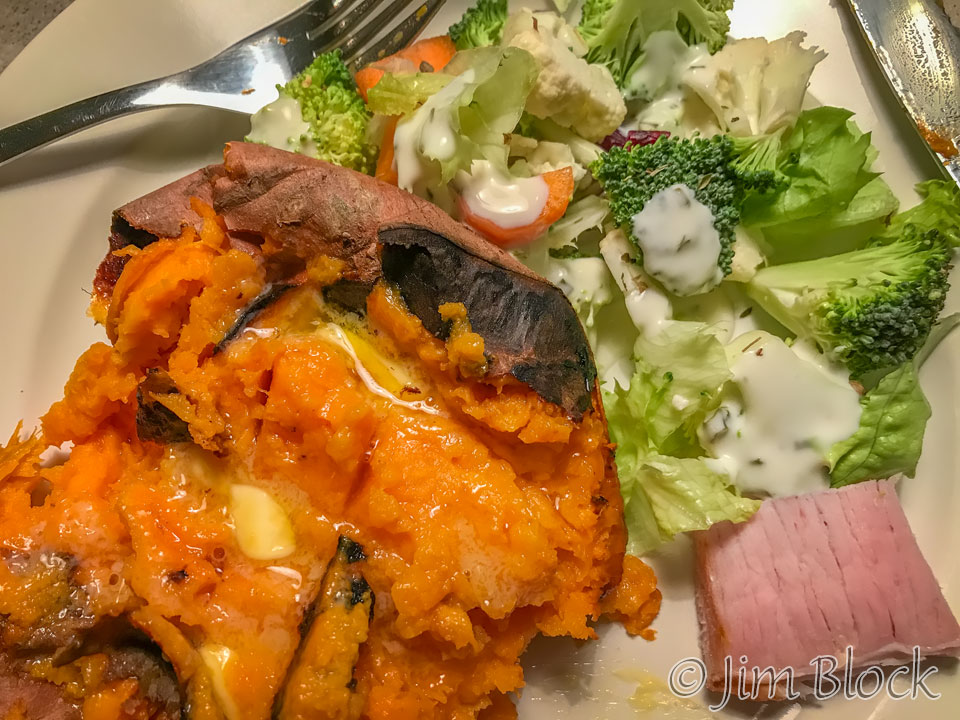 Three of us decided the left-overs would make a nice dinner, but Marc decided to go out for a hamburger. That was the only restaurant meal that any of us ate during our time in Iceland. Here is a photo of my dinner of the left-over food. It actually looks very delicious, and I enjoyed it. The huge sweet potato was great. I don’t recall what that square pink thing is in the lower right of my plate.