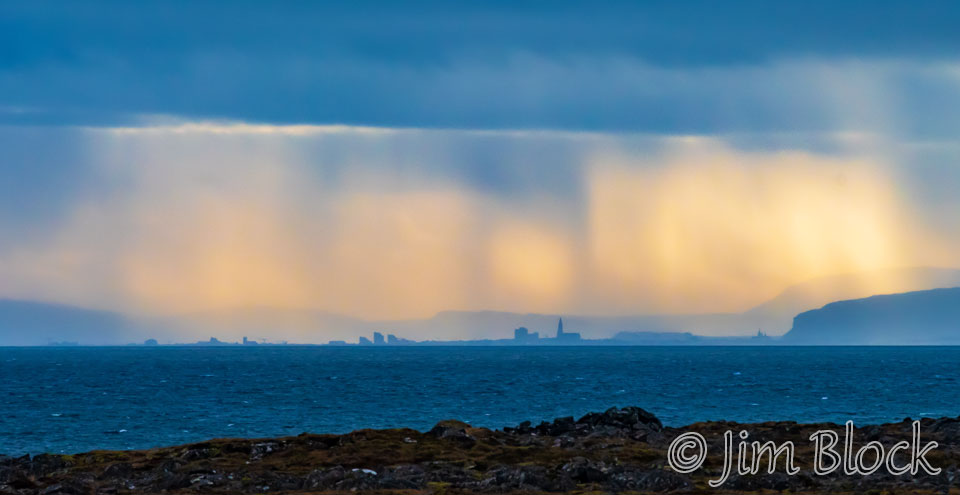 We headed to Garður. As we approached, there was a lot of drama in the sky across the water to the northeast a bit before 7 AM. The photo below shows Reykjavík in the distance. I believe the tallest building is the concrete church, Hallgrímskirkja.