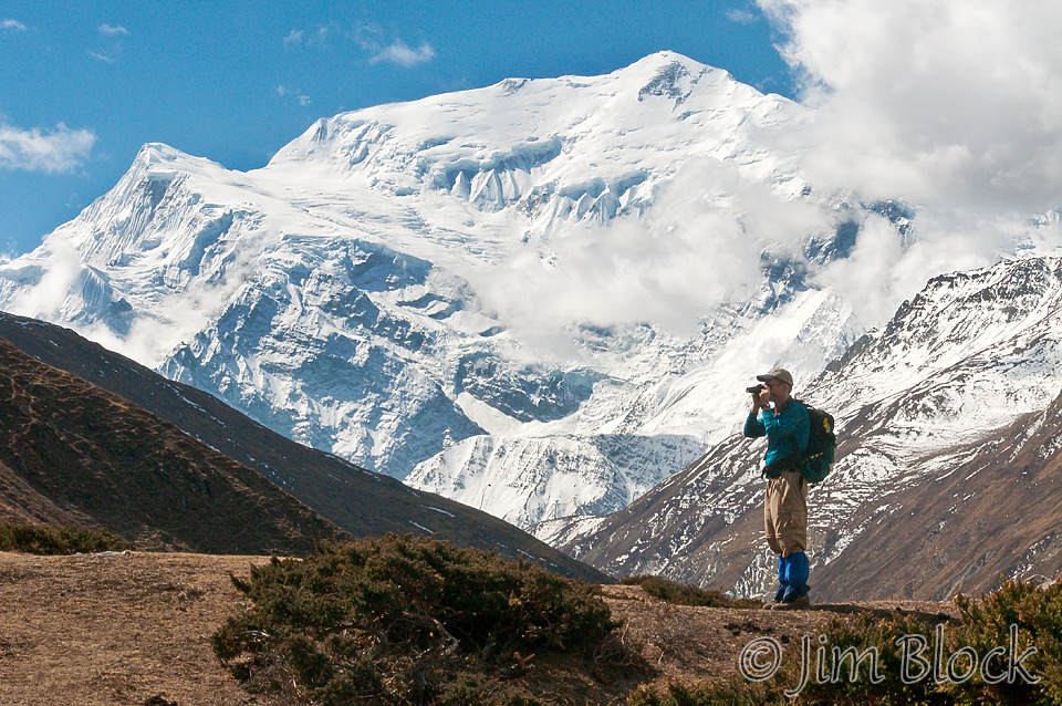 We climbed steeply from Letdar and continued to get great views of Annapurna III and Gangapurna. Here is Keg standing in front of them and photographing something else.