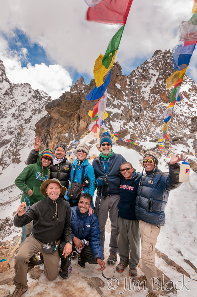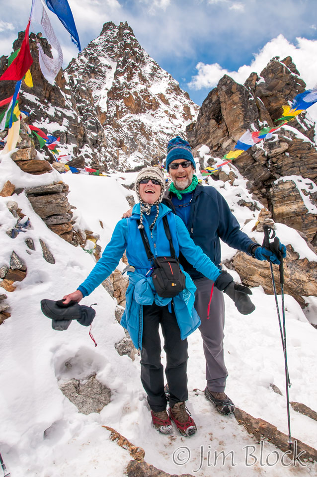 Mid-morning we had a picnic lunch of sandwiches before we reached a very snowy area. After lunch the trail got quite steep. I slogged on, getting well ahead of Carolyn and Milt. I guess I was excited about getting up to the pass to take photos there. I arrived a bit before noon. Not too much later Carolyn and Milt also reached the pass. Here is our group at Renjo La in a photo taken by Alawa Sherpa and a photo of Carolyn and Milt taken by me.