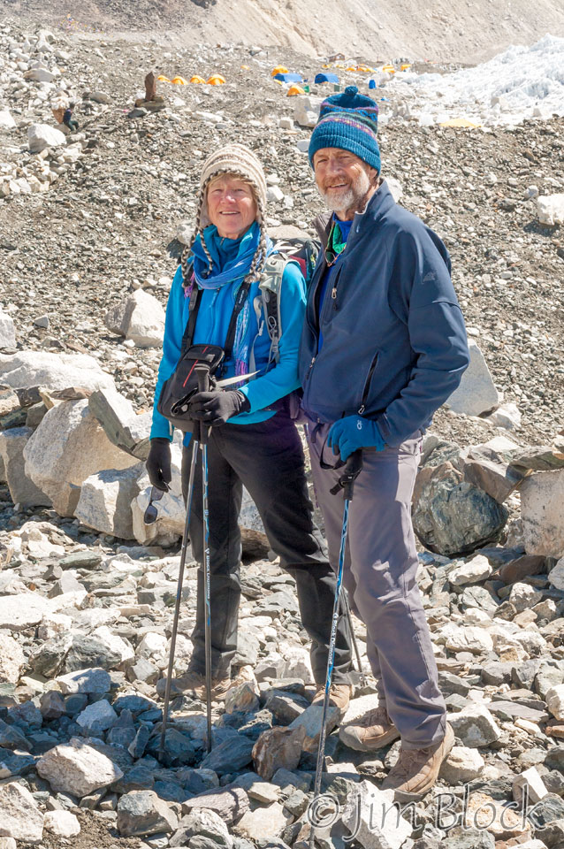 In the photo on the right, Carolyn and Milt are entering Base Camp. You can perhaps see some of the yellow and blue tents above their heads on the Khumbu Glacier.